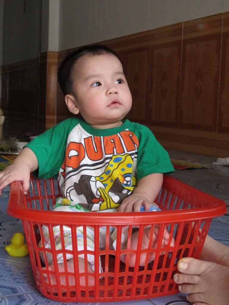 Giờ thì em đã 8 tháng rùi, ngồi thì cứ nghiêng bên này, ngả bên kia, bà toàn cho ngồi vào cái rổ đồ chơi cho chắc
